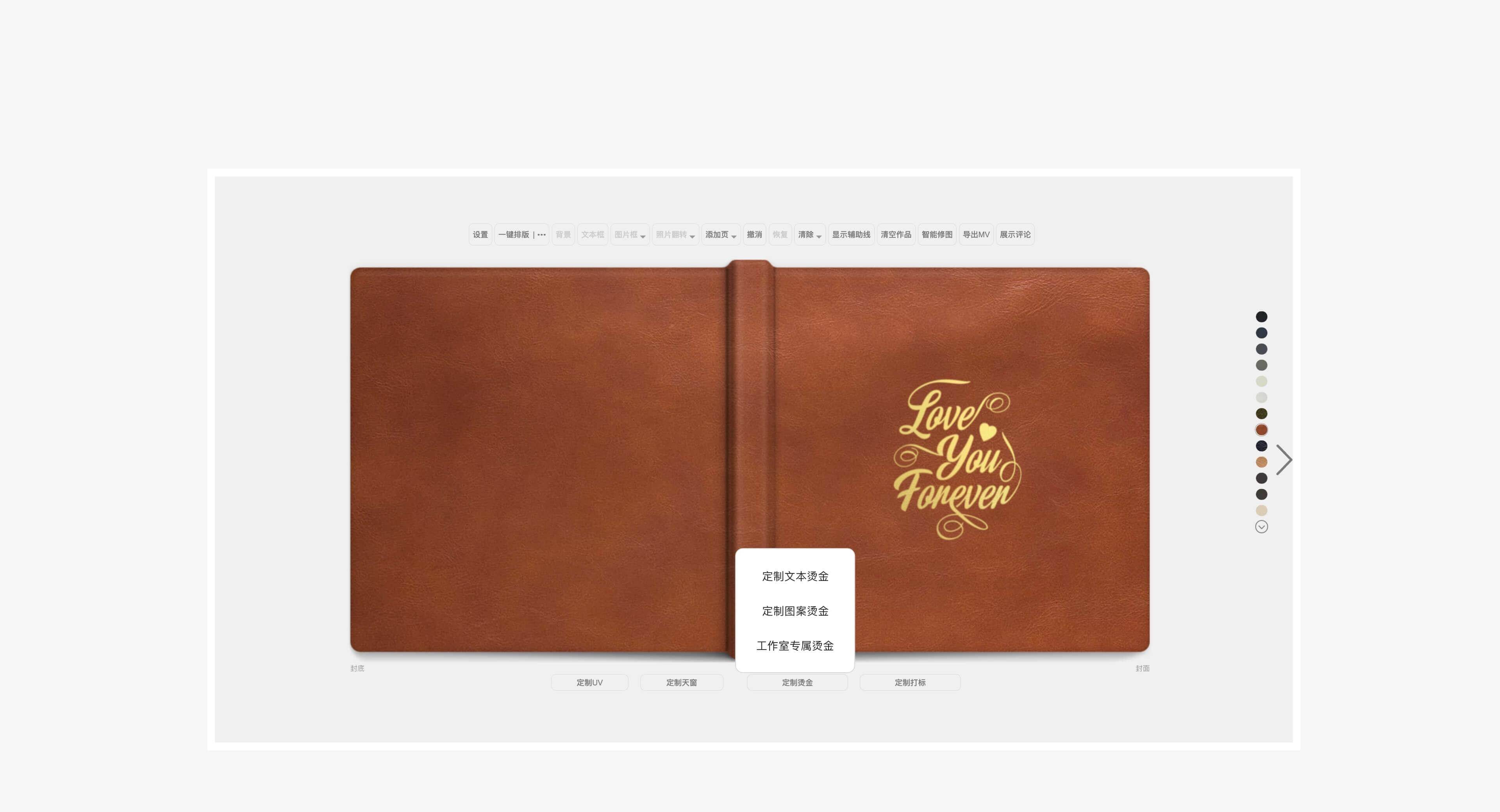 创建相册或礼盒产品 -> 点击【工作室专属烫金】 -> 选择LOGO图案,并选择烫压颜色